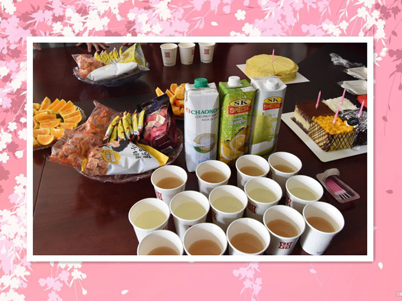 味道有創(chuàng)意的蛋糕,精美好吃的小零食,高大上的飲料,應(yīng)季的水果,無不充滿了濃濃的溫情,無不顯示人力行政部小伙伴們細膩的心思。歡快的生日歌,由衷的祝福,開心的笑靨。精美的禮物,無不傳遞著河?xùn)|公司暖暖的溫情。